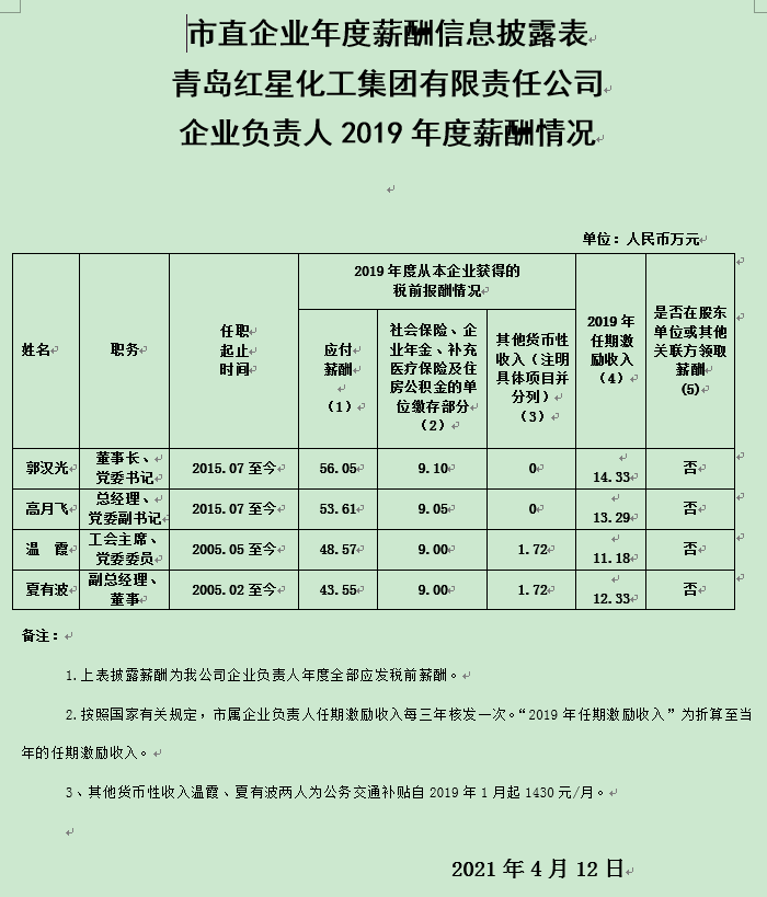 【概要(yao)描(miao)述】青島紅星化工集團有(you)限(xian)責(ze)任(ren)公司(si)企業負責(ze)人2019年度薪酬情況信息(xi)披(pi)露